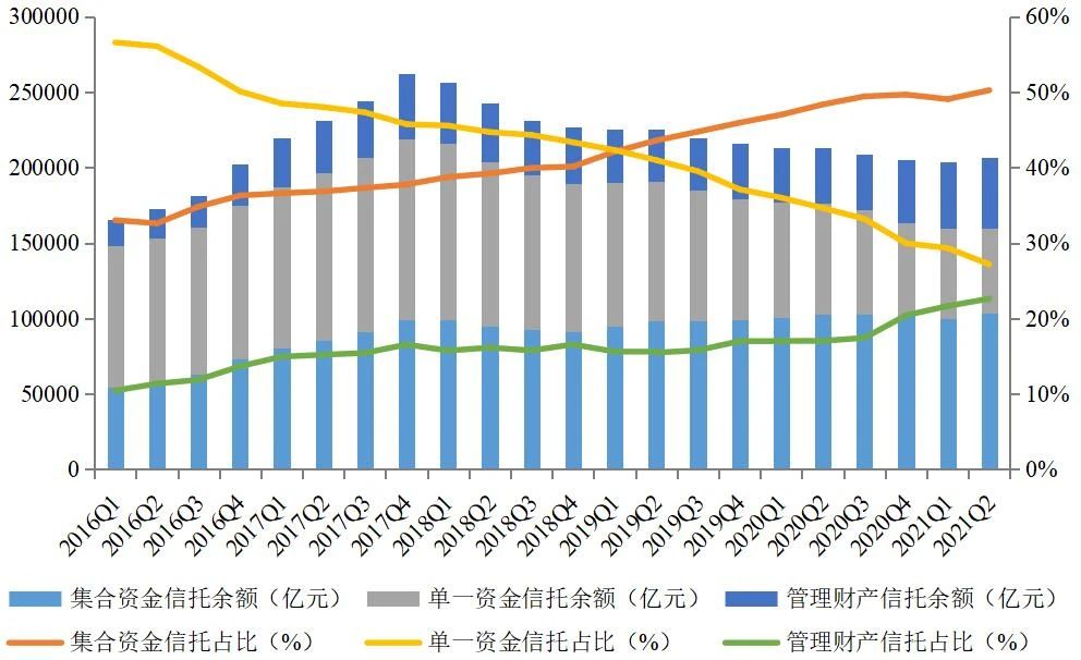 從資金來源看,截至2021年2季度末,集合資金信托規(guī)模為10.37萬億元,同比增長0.76%,環(huán)比增長3.72%;集合資金信托占比為50.23%,同比上升1.89個百分點,環(huán)比上升1.19個百分點。單一資金信托規(guī)模為5.60萬億元,同比下降23.98%,環(huán)比下降6.21%;單一資金信托占比為27.15%,同比降低7.48個百分點,環(huán)比降低2.17個百分點。管理財產(chǎn)信托規(guī)模為4.67萬億元,同比增長28.89%,環(huán)比增長5.88%;管理財產(chǎn)信托占比為22.61%,同比上升5.60個百分點,環(huán)比上升0.98個百分點。