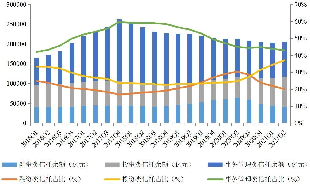 在監(jiān)管明確要求壓縮融資類信托的情況下,融資類信托規(guī)模自2020年3季度以來連續(xù)下滑。截至2021年2季度末,融資類信托規(guī)模降至4.13萬億元,同比大幅下降35.92%,環(huán)比下降7.24%;融資類信托占比降至20.02%,同比降低10.27個百分點,環(huán)比降低1.84個百分點。