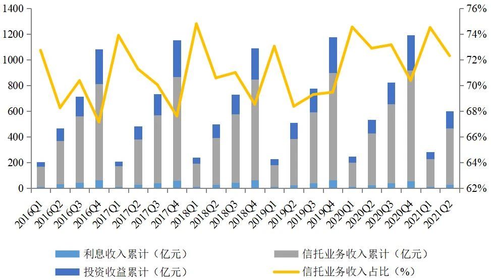 從收入結(jié)構(gòu)來看,信托業(yè)務(wù)收入是信托公司最主要的收入來源,繼續(xù)保持良好的穩(wěn)定性。截至2021年2季度末,信托公司實現(xiàn)信托業(yè)務(wù)收入435.55億元,同比增長8.52%;信托業(yè)務(wù)收入占比為72.31%,同比降低0.59個百分點。
