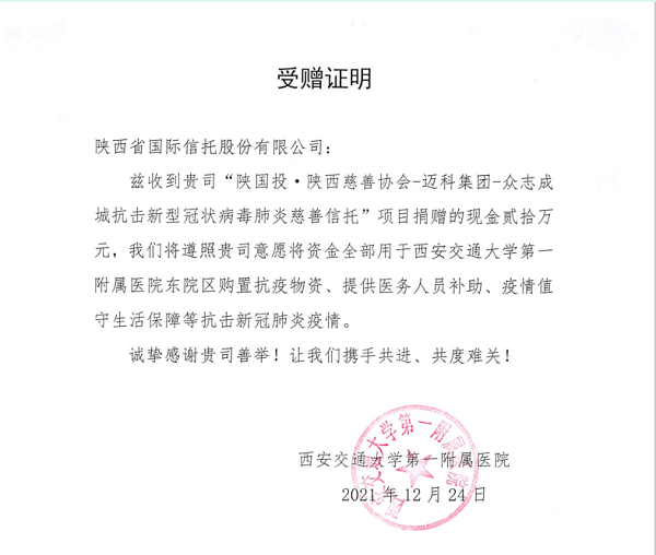在全市封閉式管理第一天,陜國投當天就完成“陜國投·陜西慈善協(xié)會-邁科集團-眾志成城抗擊新型冠狀病毒肺炎慈善信托”向西安市雁塔區(qū)慈善協(xié)會的首批50萬元資金捐贈,為雁塔區(qū)進行核酸檢測的醫(yī)護人員提供補助。12月24日,該信托向西安交通大學(xué)第一附屬醫(yī)院捐贈20萬元,該筆資金緩解了醫(yī)護人員面臨的物資短缺問題,給寒冬中堅守抗疫的醫(yī)護人員帶去溫暖。
