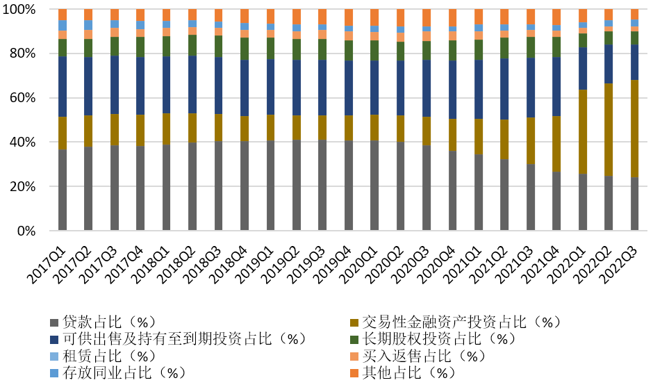三是固有資產(chǎn)中投資運(yùn)用方式進(jìn)一步占據(jù)主導(dǎo)。2022年3季度末固有資產(chǎn)通過投資方式運(yùn)用的規(guī)模達(dá)到7041.78億元,同比增長108.76億元,增幅1.57%,環(huán)比降低1.06%,占比達(dá)到82.24%,同比進(jìn)一步提升0.71個(gè)百分點(diǎn),且2022年連續(xù)3個(gè)季度的占比均保持在80%以上。貸款方式運(yùn)作的規(guī)模為628.73億元,同比下降22.58億元,降幅3.47%,環(huán)比下降1.27%,占比為7.34%,同比略降0.32個(gè)百分點(diǎn),相對占比自2018年2季度跌至谷底以后總體保持小幅回升態(tài)勢。貨幣類資產(chǎn)規(guī)模為412.53億元,同比下降2.88%,環(huán)比下降16.40%,占比4.82%,同比略降0.18個(gè)百分點(diǎn),占比總體呈現(xiàn)持續(xù)下降態(tài)勢。