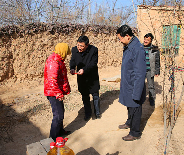 2015年2月6日,公司黨委書記、董事長(zhǎng)薛季民、紀(jì)委書記、工會(huì)主席王曉燁帶領(lǐng)公司有關(guān)人員,前往省級(jí)“兩聯(lián)一包”定點(diǎn)扶貧村——澄城縣趙莊鎮(zhèn)高塬村扶貧慰問(wèn),為該村特困家庭和困難戶送去大米、食用油和慰問(wèn)金等,并帶去公司全體員工的親切關(guān)懷及節(jié)日祝福。