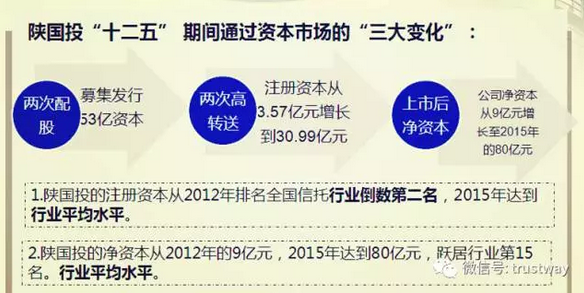 “2012年的時(shí)候,陜國(guó)投3.57億元的注冊(cè)資本在行業(yè)排名倒數(shù)第三?!毖久窀锌?,2015年,公司繼續(xù)把握住了資本市場(chǎng)階段性機(jī)會(huì),完成了“十二五”時(shí)期的第二次增資擴(kuò)股,募集資本32億元,再次實(shí)施十送十,使公司注冊(cè)資本達(dá)到了30.9億元,凈資產(chǎn)達(dá)到80億元,資本實(shí)力進(jìn)入行業(yè)第一梯隊(duì)。