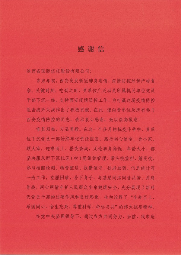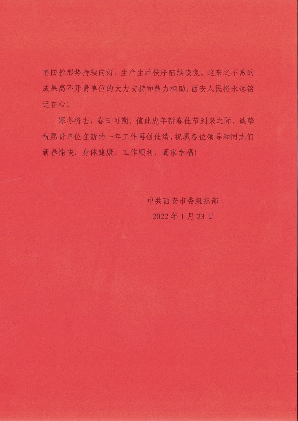公司收到中共西安市委組織部發(fā)來(lái)的感謝信