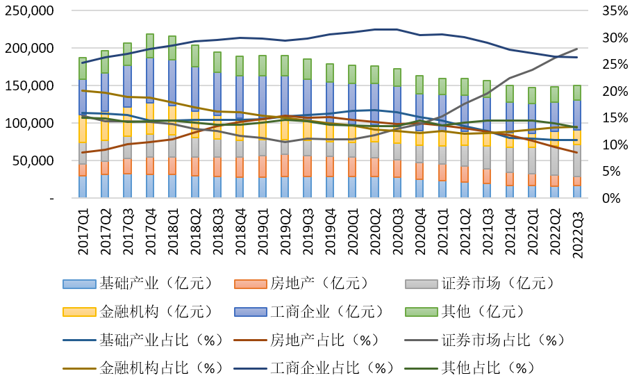 2.投向工商企業(yè)、基礎(chǔ)產(chǎn)業(yè)、房地產(chǎn)領(lǐng)域的規(guī)模和占比進(jìn)一步下降。當(dāng)前實(shí)體經(jīng)濟(jì)增速回落,投融資需求有所減弱,房地產(chǎn)等重點(diǎn)領(lǐng)域風(fēng)險(xiǎn)暴露,對(duì)信托業(yè)務(wù)的傳統(tǒng)投向領(lǐng)域帶來(lái)一定影響。一是投向工商企業(yè)的資金信托規(guī)模在2022年3季度末為3.95萬(wàn)億元,同比下降0.59萬(wàn)億元,降幅13.07%,環(huán)比增長(zhǎng)0.95%;較2021年末規(guī)模下降5.00%;占比下降至26.33%,同比下降2.69個(gè)百分點(diǎn),環(huán)比下降0.04個(gè)百分點(diǎn)。二是投向基礎(chǔ)產(chǎn)業(yè)的資金信托規(guī)模為1.63萬(wàn)億元,同比下降0.33萬(wàn)億元,降幅17.04%,環(huán)比增長(zhǎng)1.57%;較2021年末規(guī)模降低3.55%;占比下降至10.84%,同比下降1.68個(gè)百分點(diǎn),環(huán)比下降0.05個(gè)百分點(diǎn)。三是投向房地產(chǎn)的資金信托規(guī)模為1.28萬(wàn)億元,同比下降0.67萬(wàn)億元,降幅34.20%,環(huán)比下降9.49%;較2021年末規(guī)模降低27.30%;占比下降至8.53%,同比下降3.89個(gè)百分點(diǎn),環(huán)比下降1個(gè)百分點(diǎn)。此外,投向其他的資金信托規(guī)模為1.97萬(wàn)億元,同比下降0.29萬(wàn)億元,降幅12.82%,環(huán)比下降4.87%;較2021年末規(guī)模降低9.25%;占比下降至13.12%,同比下降1.30個(gè)百分點(diǎn),環(huán)比下降0.82個(gè)百分點(diǎn)。